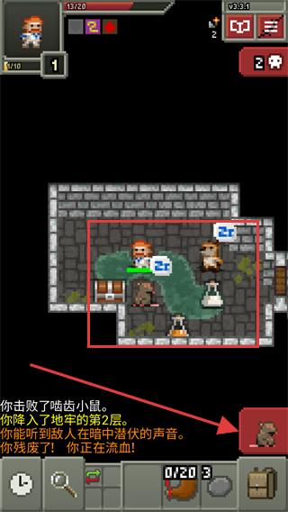 2、紅框標(biāo)戰(zhàn)斗區(qū),降入【地牢-第2層】,提示流血、能聽(tīng)到敵人潛伏聲音。