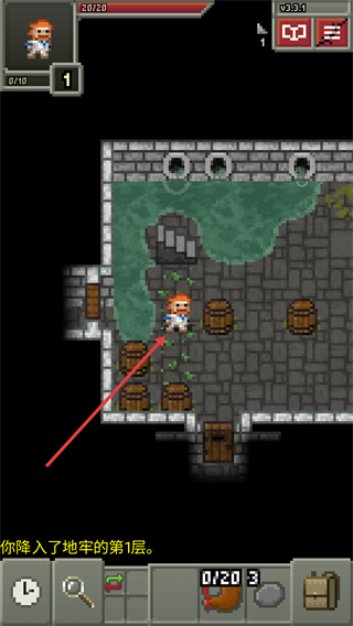 3、角色降入【地牢-第1層】,箭頭指向場(chǎng)景內(nèi)木桶區(qū),界面顯示物品欄可開(kāi)展地牢探索操作。
