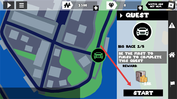 1、找到帶有汽車標識的BIG RACE任務,點擊下方START按鈕開啟。