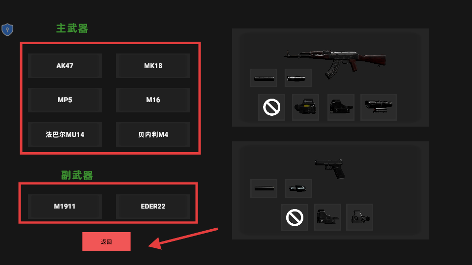 1、任務前選主武器【AK47】-【M16】等、副武器【M1911】-【EDER22】,搭配后點返回備戰。