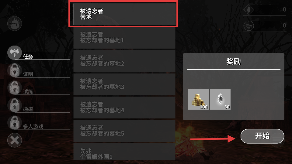 1、選擇【被遺忘者營地】任務,點擊【開始】,可獲【100】金幣、【30】記憶獎勵,開啟冒險。