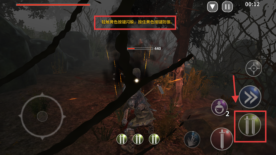 2、戰(zhàn)斗時輕觸閃躲、按住防御,點擊綠色雙劍按鈕釋放連攜攻擊,快速打擊敵人,注意走位。