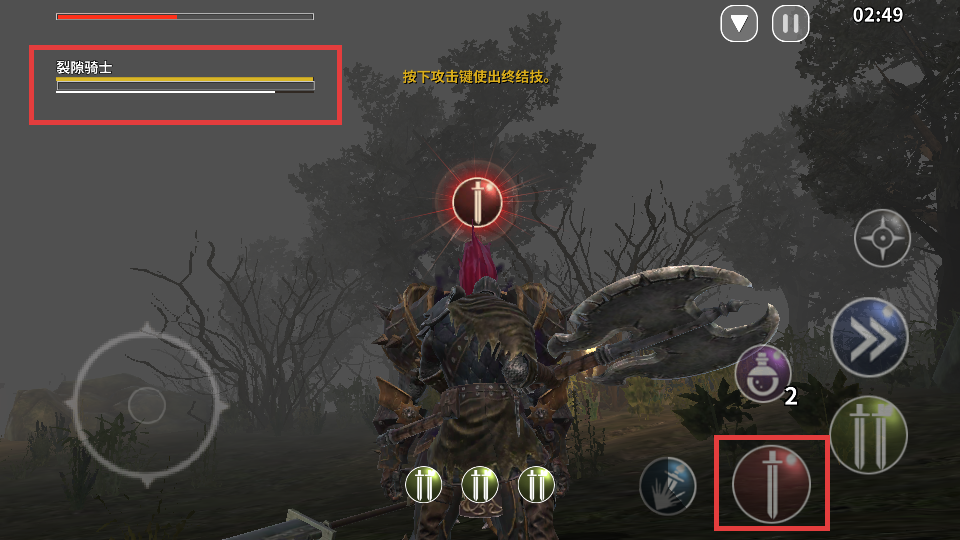 3、對陣【裂隙騎士】,觀察血條,出現(xiàn)終結(jié)技提示時點擊紅色攻擊鍵,釋放終結(jié)技高效擊殺。