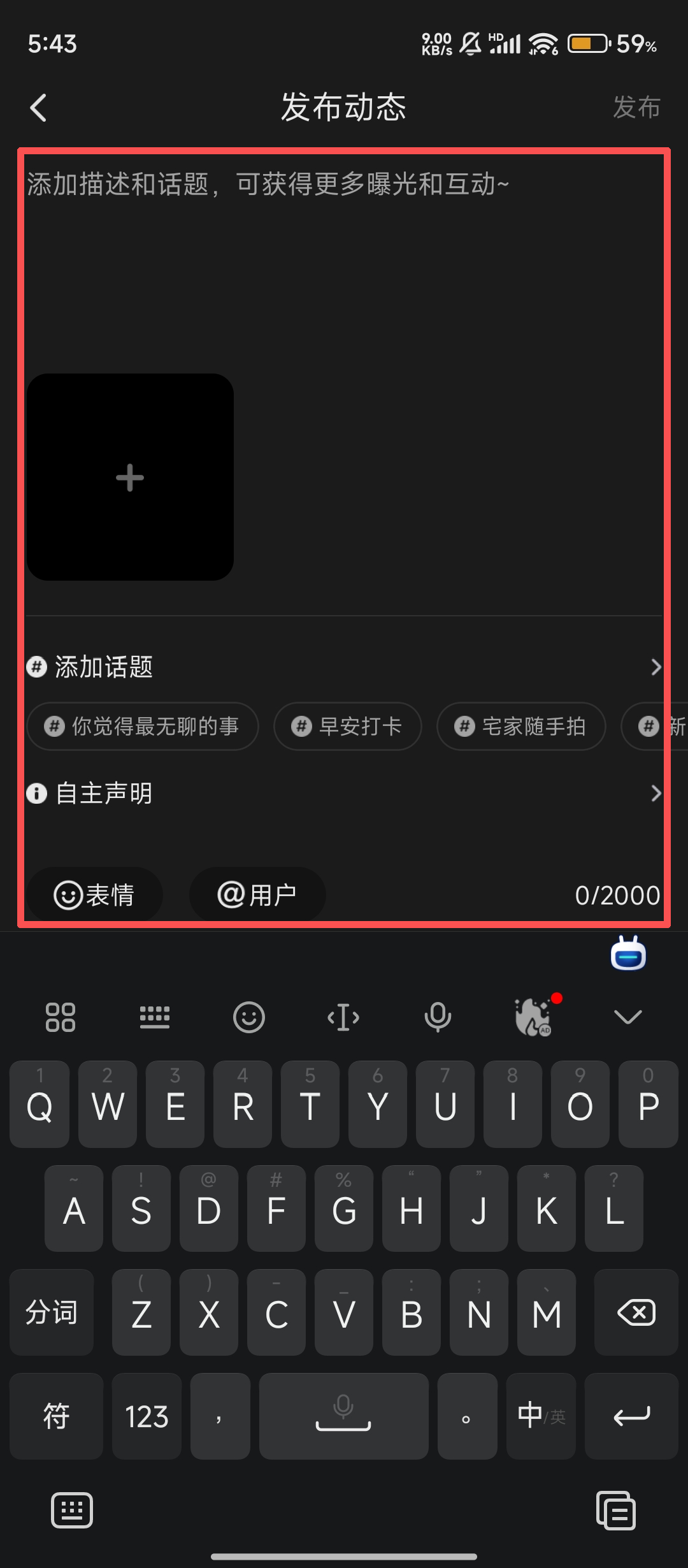 3、進(jìn)入【發(fā)布動(dòng)態(tài)】頁(yè)面后,在編輯區(qū)域添加描述、話題,還能插入圖片,把動(dòng)態(tài)內(nèi)容打造得豐富有趣哦。