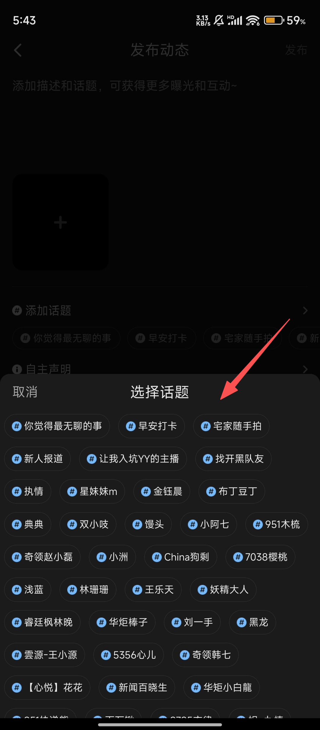 4、在【選擇話題】彈窗中,挑選合適的話題,像【宅家隨手拍】這類(lèi),選好后能讓你的動(dòng)態(tài)獲得更多曝光呢。