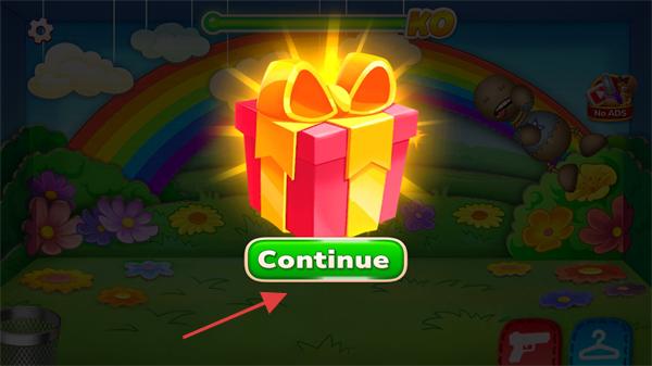 1、擊敗木偶人后出現禮盒,點擊【Continue】按鈕領取獎勵,推進游戲流程。