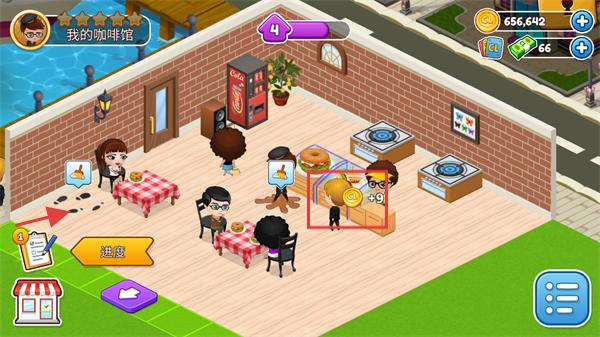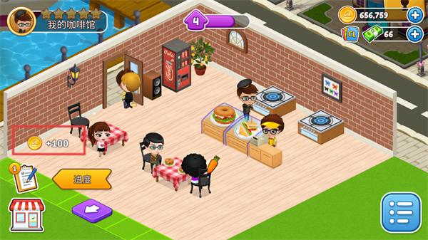 1、在經營界面,顧客消費后可獲取金幣,點擊【進度】按鈕查看任務推進情況。